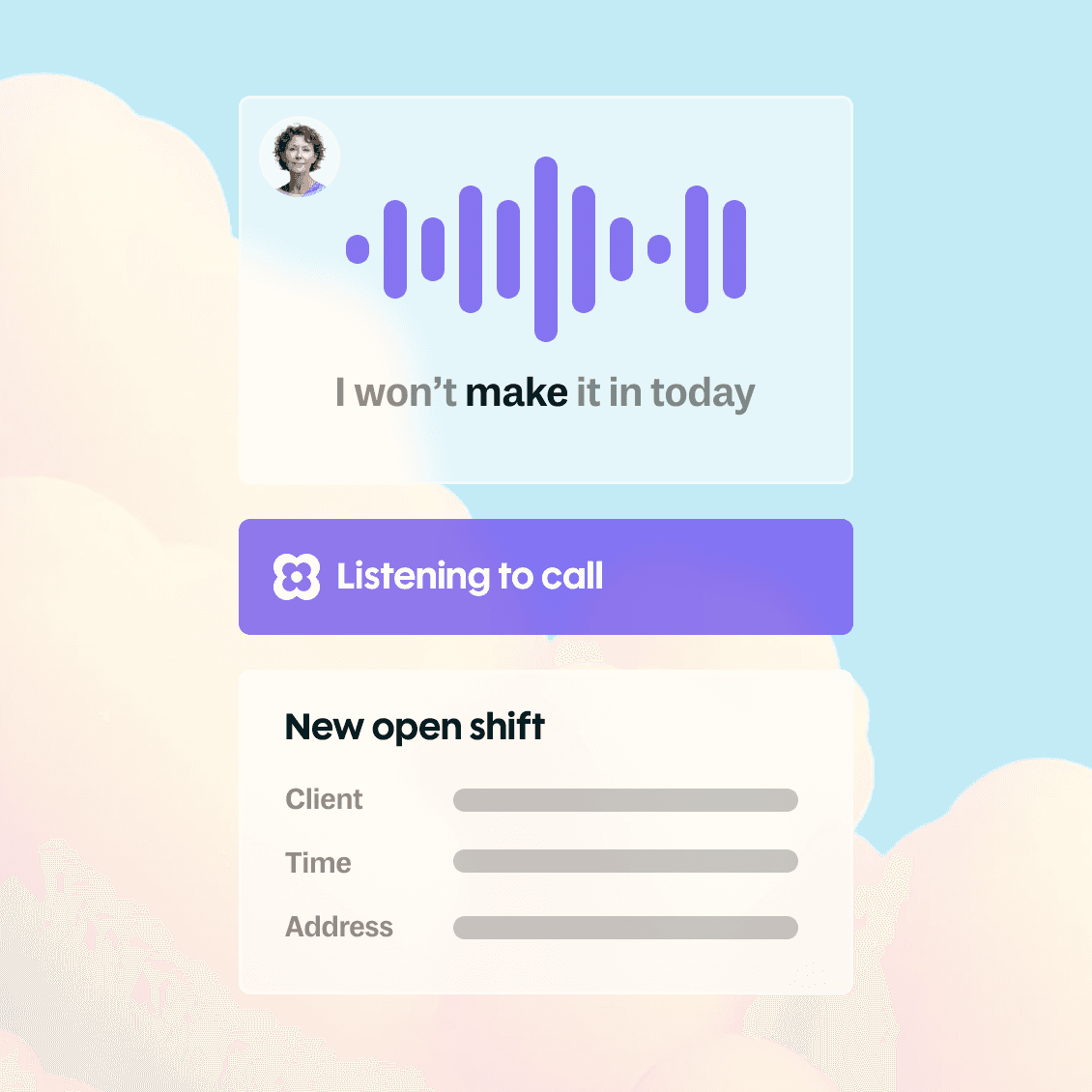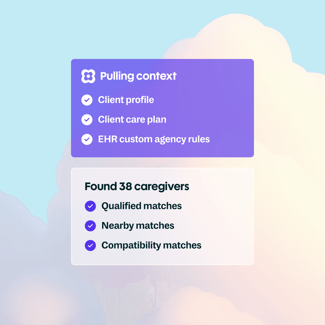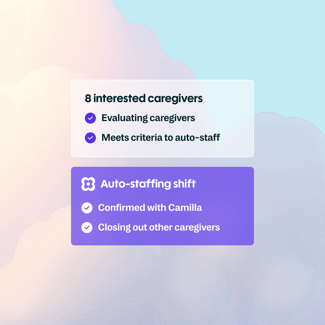Identifies and talks with every qualified caregiver the moment a shift opens. Assigns the shift, updates the EHR, notifies the client, and brings your team the summary. No loose ends.