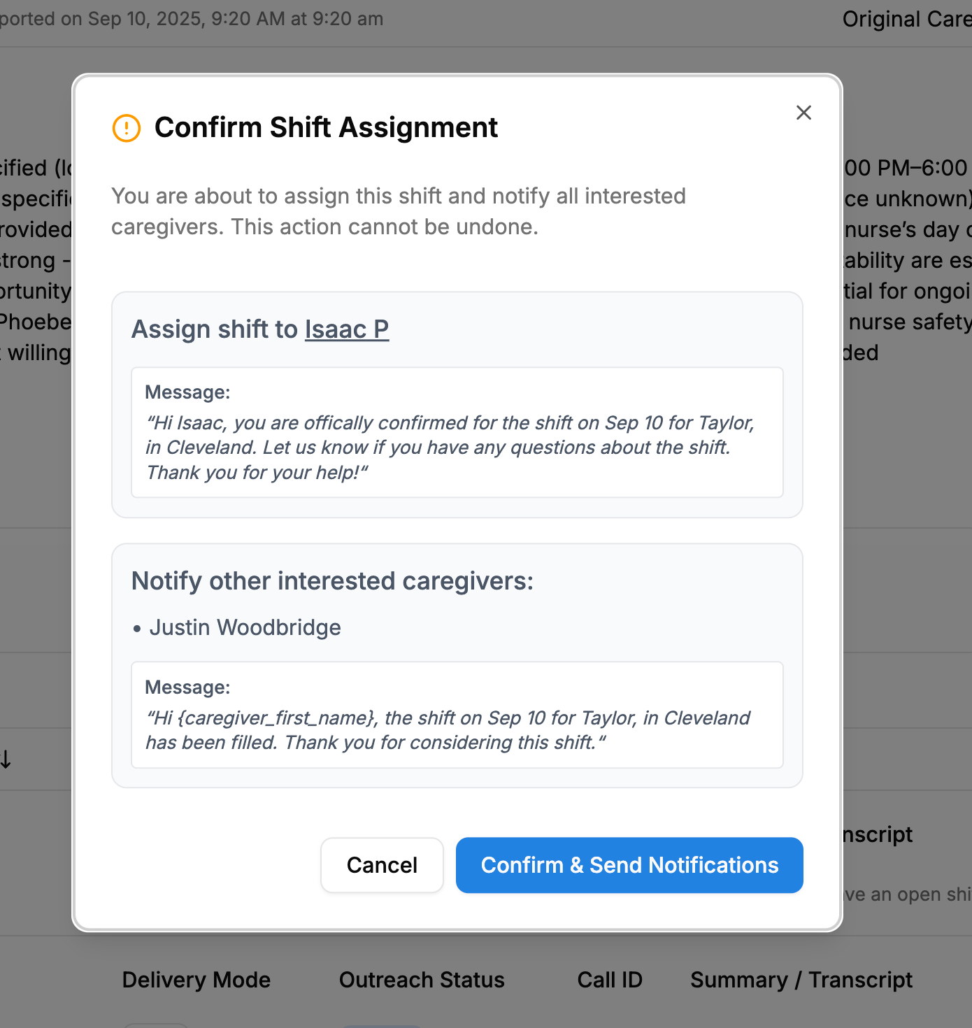 Just hit “Assign and Fill” on your caregiver, and we’ll send a message to the caregiver confirming that they are good to go, and also notify the other interested parties that they are not getting the shift.